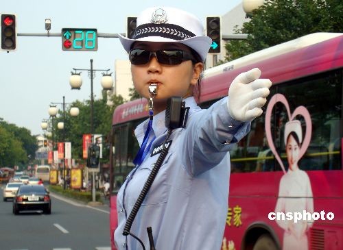 2009年7月3日,一位女交警在烈日下指揮蘇州人民路交通。近日,古城蘇州街頭出現了首批英姿颯爽的女交警,她們靚麗的警容、警姿和規范的指揮手勢更好地樹立了城市形象,成為該市一道靚麗風景線。
