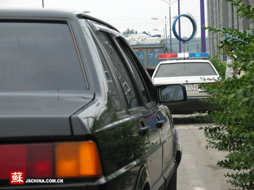 這位司機在路口注意到了沒有交警,卻沒注意到慢車道上停著一輛牌號蘇AET355的地方牌照轎車,轎車裡卻坐著一名交警,專門負責通報闖信號的車號,便於下面的交警攔截罰款。這是發生在6月30號的事情,地點是南京浦口區東南大學校區附近一條新修的大馬路,執法者是南京交警九大隊的交警。