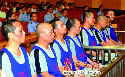 跨3省、7市的假煙制售鏈條的國內終點在東莞、深圳,然後延伸至20多個國家和地區,假煙涉案金額1.56億多元,這是東莞煙草專賣局1988年成立以來查獲的最大假煙出口案。昨日,涉案15名被告人和1家被告單位在東莞中級人民法院過堂受審(如圖,蘇仕日攝)。公訴機關認為應以銷售偽劣產品罪追究其刑事責任。公訴人花了40分鍾纔讀完近萬字的起訴狀,狀中列舉了26宗假煙販賣指控。