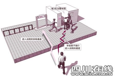 躲避安檢門 可疑男子被擋下昨天上午11點,武侯區法院大門安檢區,3名神情嚴肅的法警和往常一樣,對每一個進入法院的人員進行例行安檢。這時,一名身穿黃色T恤、灰色長褲的男子進入了法警的視線,並引起他們的警覺。