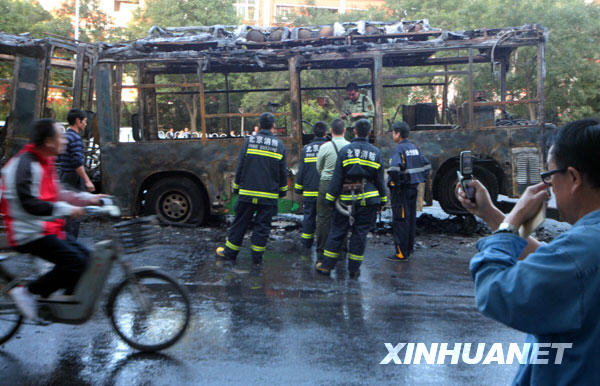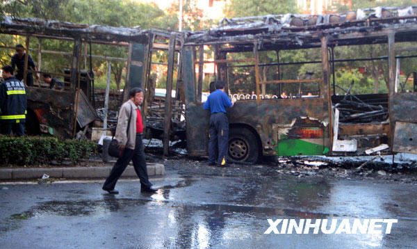 9月21日拍攝的被燒毀的17路公交車。新華社發(吳長青 攝)