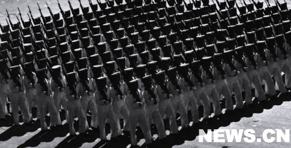 今天,天安門廣場舉行盛大國慶閱兵。英雄的人民解放軍陸、海、空三軍部隊,以雄壯的陣容通過天安門廣場,接受檢閱。分列式開始了。迎風招展的"八一"軍旗,引導著軍事學院和步兵、炮兵、工程兵、坦克兵、航空兵、鐵道兵、海軍等學校的隊伍,首先進入天安門廣場。他們排著二十四路縱隊,精神抖擻,齊步前進。走在最前面的是第二次國內戰爭時期的紅軍戰士吳華奪少將和胡定千少將。這兩位親密的老戰友,在長征和抗日時期都一起並肩作戰。今天,他們又並肩走過天安門廣場。
