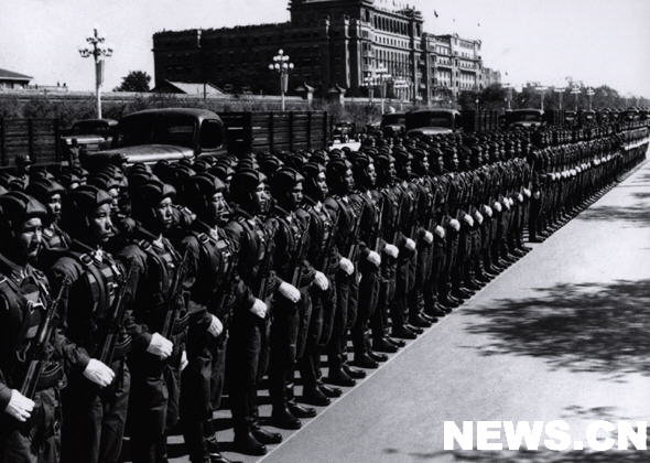 裝備精良的步兵、摩托步兵和空降兵等機械化部隊的強大陣容循序而過。步兵頭戴鋼盔,手執自動步槍。整齊如一的前進步伐,充分表現高度的訓練水平。受檢閱的摩托化步兵第一連,是當年堅持井岡山斗爭的紅軍第一軍第一師的一個部隊。他們在長征途中,強渡烏江天險;在抗日戰爭中參加過平型關大戰。今天,它已成長為具有高度機動能力的機械化部隊。