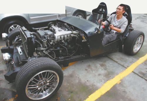 『半年前我一個好朋友興趣大發,准備自己造車,首先弄個車架、發動機和手動變速箱……』昨日,網名為『聖之夜』的網友在四川某汽車論壇上發帖稱,他的朋友制作了成都首輛DIY(自己動手)漂移車。該網友上傳了一組反映該汽車組裝全過程的照片。此外,還有一段該車不久前在金港賽道上玩漂移的視頻。從照片中記者看到,這是一輛酷似老爺車的黑色敞篷車,汽車引擎、油箱、車座等全部裸露在外,車座是賽車椅子,車座兩旁沒有安裝車門,真可謂全敞篷。