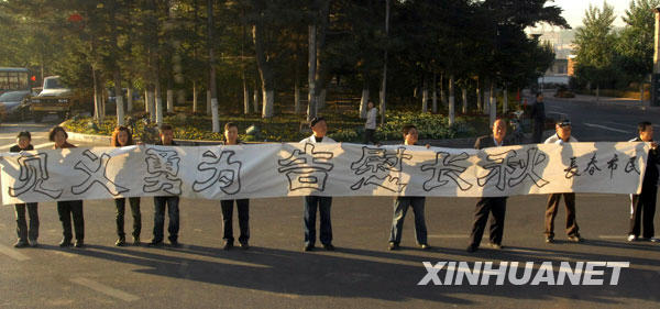 10月11日,長春市民在街頭打出橫幅,送別紀長秋。新華社記者蔣林攝