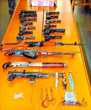 核心提示:汕頭一個『地頭蛇』家族經12年蛻變成『黑社會性質犯罪組織』警方在其窩點收繳上膛的微型衝鋒槍、五四式手槍和仿六四式手槍等槍械