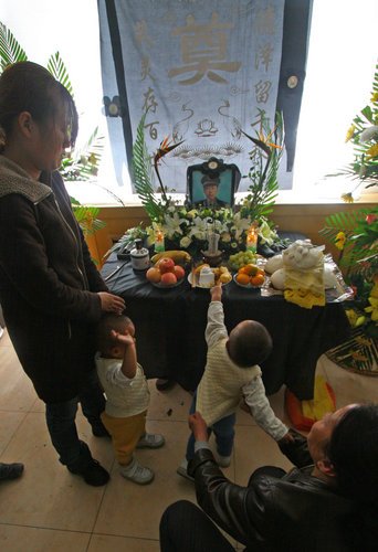 2009年10月21日,呼和浩特犯人越獄遇害獄警蘭建國家中,家人為其設靈堂。悲痛的家人。攝影:北方/CFP