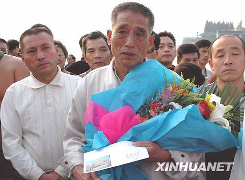 10月26日,參與救助落水大學生的61歲寶塔灣冬泳隊老隊員魯德忠接過學生們致謝的鮮花後潸然淚下。新華社記者 魏夢佳 攝