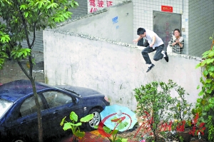 輪到女孩子時,後面的男士則在後面助推一把。記者遠遠望去,一位穿著裙子的女孩不顧『走光』的尷尬,在男友推托下爬上牆頭,卻不敢跳到牆外,而後面的人卻不斷地催促她,『快點快點,你不跳我們還要跳呢』,騎在牆頭的她上下不得甚是尷尬。最終,她腳踩到牆頭的一輛轎車,纔安全落到地面,弄得轎車『滴滴』叫了很久,車主聞聲趕來心疼得直咧嘴。