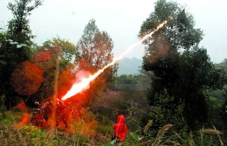 隨著一聲令下,『砰!砰!』只見兩條火龍衝出30米開外,直搗蜂窩,馬蜂窩當即變成火球,蜂巢內外成群的馬蜂瞬間變成焦炭,『呼呼』往下落。戰士持續噴火,馬蜂窩變成碎片,包裹著火花散落到農田裡……