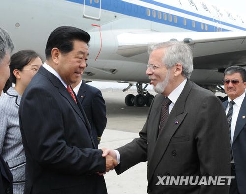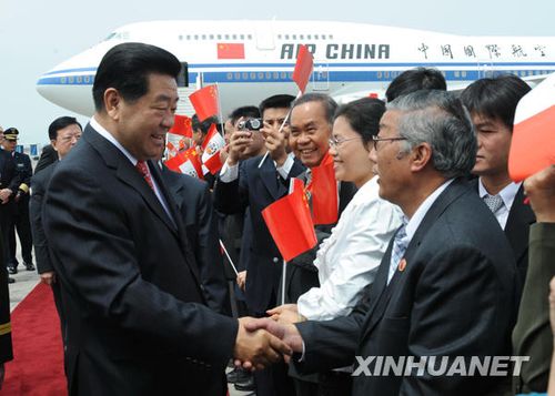 11月22日,應秘魯政府邀請,全國政協主席賈慶林乘專機抵達秘魯首都利馬,開始對秘魯進行正式友好訪問。這是賈慶林與到機場迎接的秘魯外交部高級官員握手。新華社記者李學仁攝