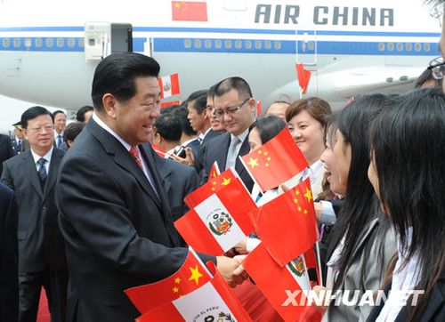 當地時間22日上午10時許,賈慶林乘坐的專機降落在秘魯G8空軍基地。秘魯外交部高級官員、中國駐秘魯大使趙五一、使館工作人員、中資機構和華僑華人代表等到機場迎接。全國政協副主席兼秘書長錢運錄及其他陪同人員同機抵達。