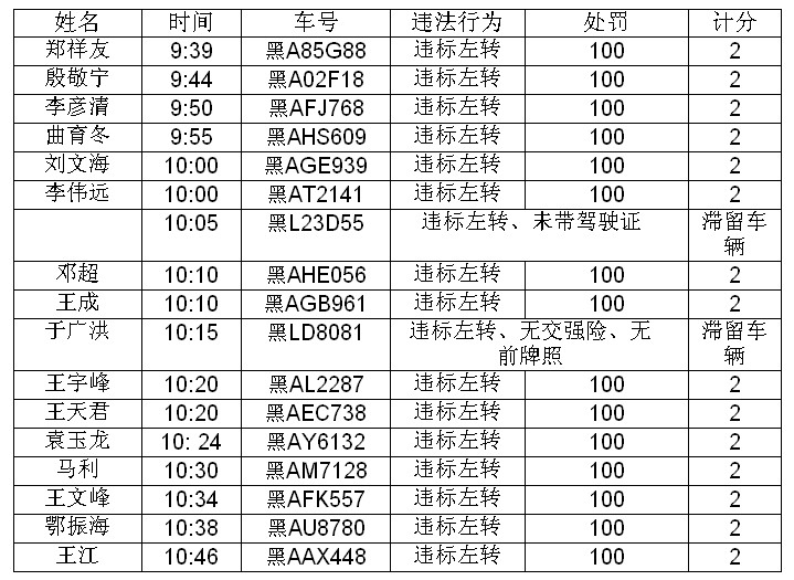 哈爾濱道裡區經緯街17臺車違法轉彎被處罰