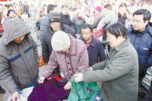 三人圍住買毛衣的老大媽。本報記者 閆志國 攝