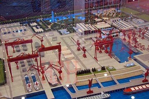 資料圖:國外網站登載的中國船舶工業公司展出的長興造船基地的縮比例模型當中,將一個可用於建造航母的船塢揭示出來
